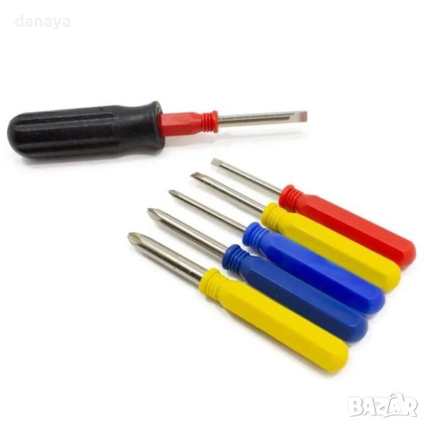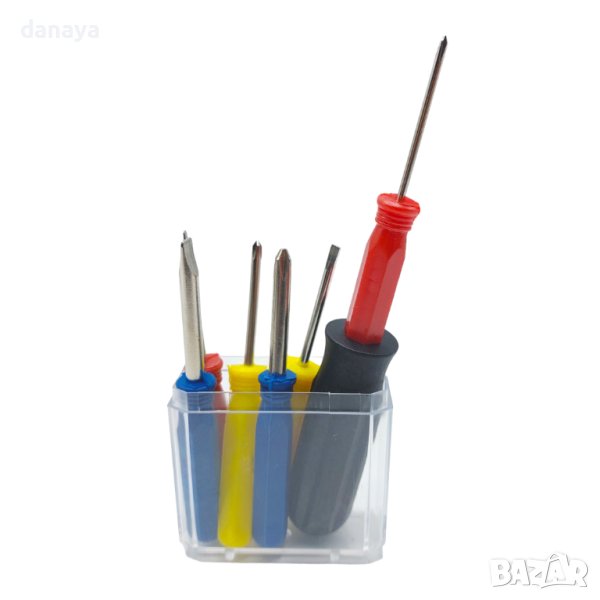 Комплект от 6 броя отвертки – 3 кръстати и 3 прави с включен накрайник за лесна работа. Комплектът се предлага в пластмасова прозрачна кутия за съхранение. Идеални са за домашни ремонти и прецизна работа с малки предмети като малки домакински уреди, часовници, различни кутии и др.