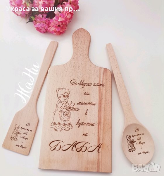 Подаръчен комплект за БАБА за имен ден, рожден ден, юбилей, Бабинден 8ми Март* дъска*шпатула* лъжицаКато може да се добави име или без