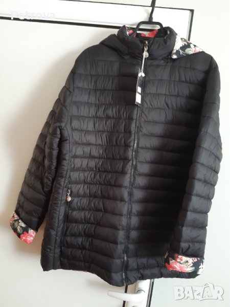 Ново дамско яке, с две лица, джобове с цип, има качулка , която се сваля. Размери дължина гръб пт врата надолу 75 см, ширина 55 см, ръкав от рамо 65см, от подмишница 45,5 см.