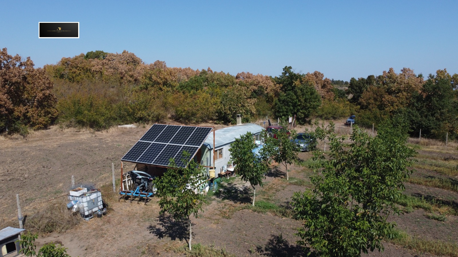 фургон с отопление. Трактор(японски), фреза, вентилаторна пръскачка, плюг и култиватор, инвентар достатъчен за самостоятелна поддръжка на градината.Водоснабден чрез сонда, допълнителен басейн от 30куб.м за поливни нужди при необходимост. 8бр Соларни панели за електрозахранване.