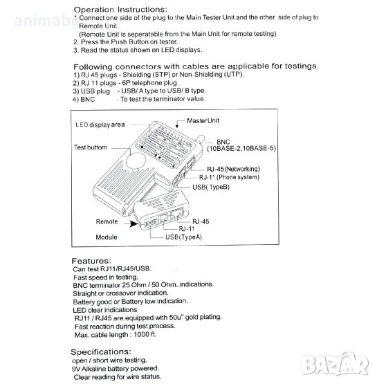 Светодиодите показват връзки и грешки на проводника и щифтовете. RJ-11/RJ-45 са оборудвани с 50u златно покритие. 300 фута тестово разстояние (RJ-45/RJ-11/BNC).