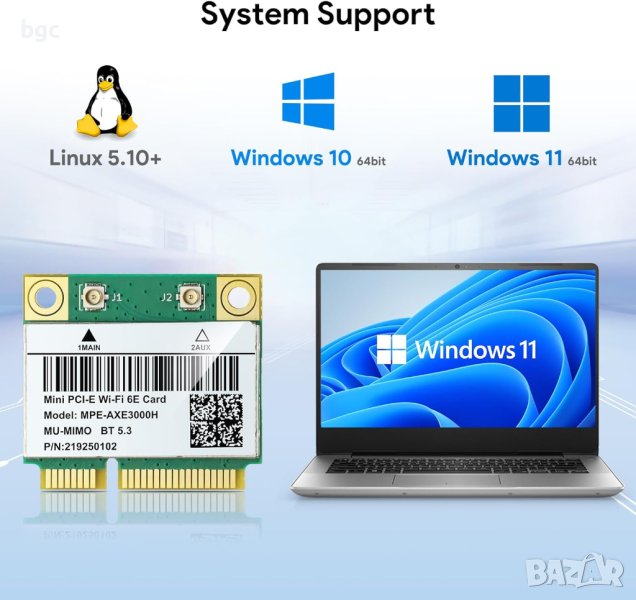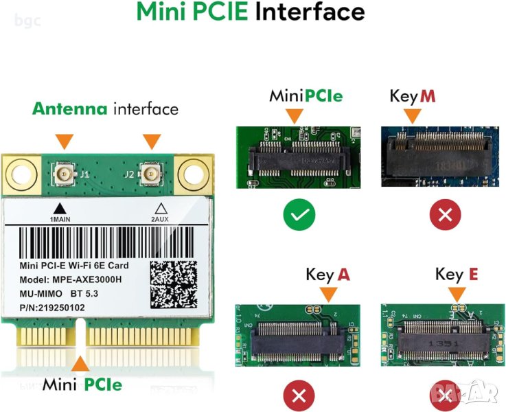 - 【Mini PCIe интерфейс】 С мини PCI-E интерфейс тази мрежова карта Wi-Fi 6 Half mini PCIe е лесна за инсталиране в съвместими устройства като преносими компютри и мини компютри. Почти всички компютри с mini PCI Express интерфейси са съвместими, като Samsung/Dell/Sony/ACER/ISUS/MSI/Clevo/Terransforce/Hasee и т.н., но не поддържат всички IBM/Thinkpad/Lenovo/HP лаптопи и дънни платки AMD.