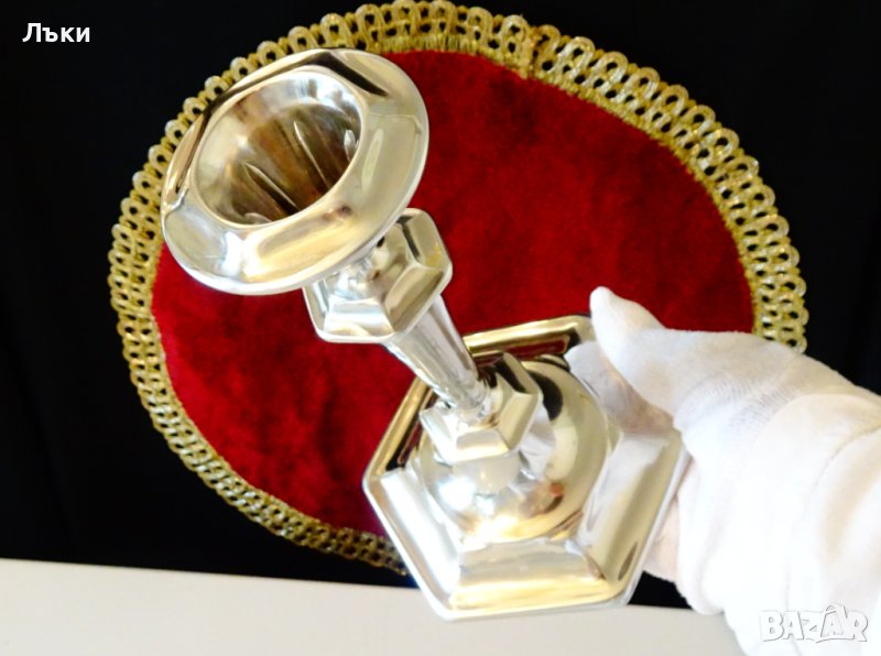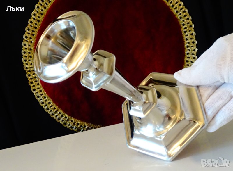 с висока проба сребро.Маркиран за произход,материал и посребряване,вътре в чашката за свещта.Свещника има красив релефен дизайн в стил Art Deco и огледален блясък.Височина 19 см.,диаметър на основата 12 см.Тегло 340 гр.