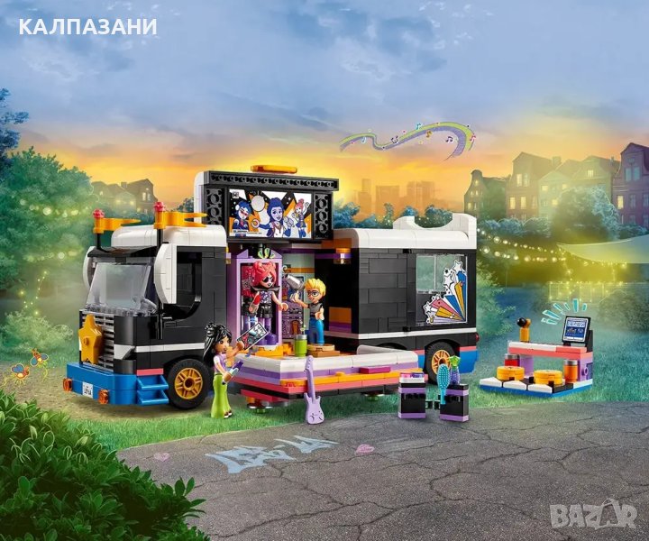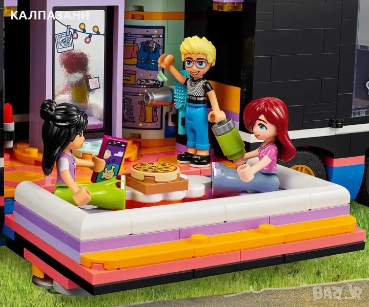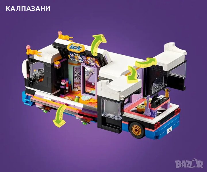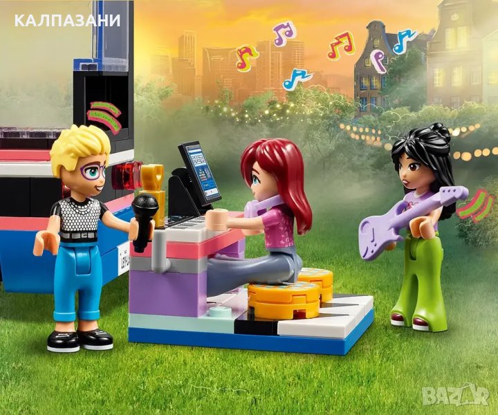 - Комплект за игра с бус за турне за музикални ролеви игри – комплектът LEGO® Friends Бус за турне на поп звезди за момичета и момчета над 8 години включва 4 миникукли и много аксесоари