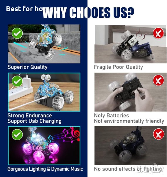 -Тази RC каскадьорска кола, оборудвана с новата 2,4 GHz технология, можете да се състезавате с до 10 приятели, без да нарушавате честотите на отделните коли.