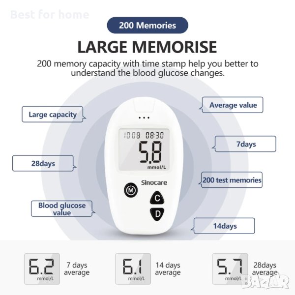 Ясният дизайн на голям екран е удобен за възрастните хора да четат собствените си стойности на измерване след кръвен тест, а бутонът за изваждане на лентата може да гарантира, че няма да сте заразени от лентата за измерване на кръвната захар.