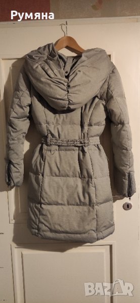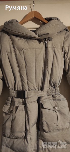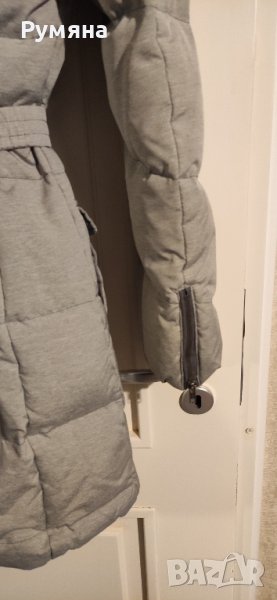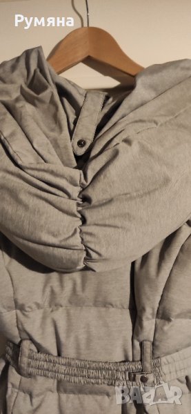 Светлосиво, пухено яке. Много топло, с интересен асиметричен цип, на ръкавите също има ципчета. Качулката е много обемна и разкошна- има лентички, с които може да се сгъне и се превръща в чудесна, богата яка. Има ластичен колан.
