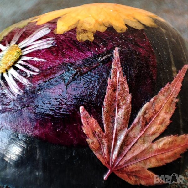 Използвани цветя: венчелист от божур, керия, маргаритка, японски кленов лист. Размер: 5.5 x 5.3 x 3.4 cm. Тегло 136.6 gr. Цена 16 лв.