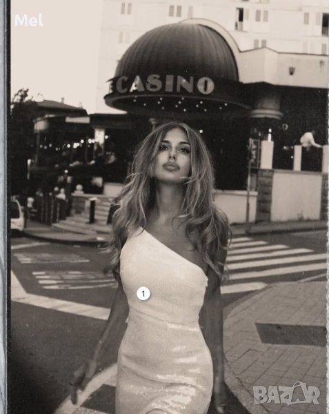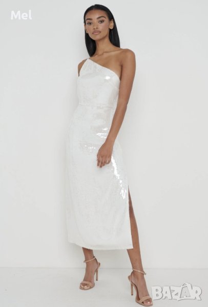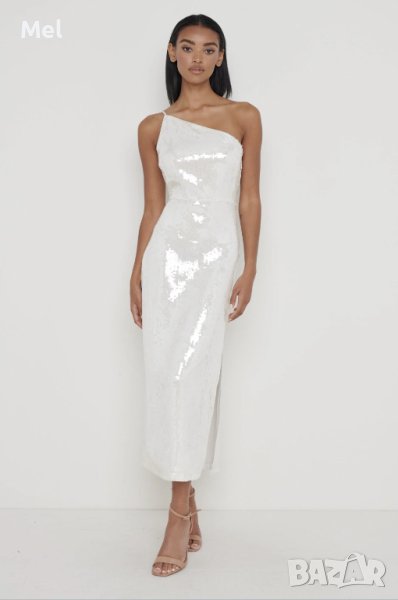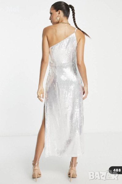 Pretty Lavish дълга рокля с пайети, сребрист/бяла, едно рамо, р-р S → Обява 43857189