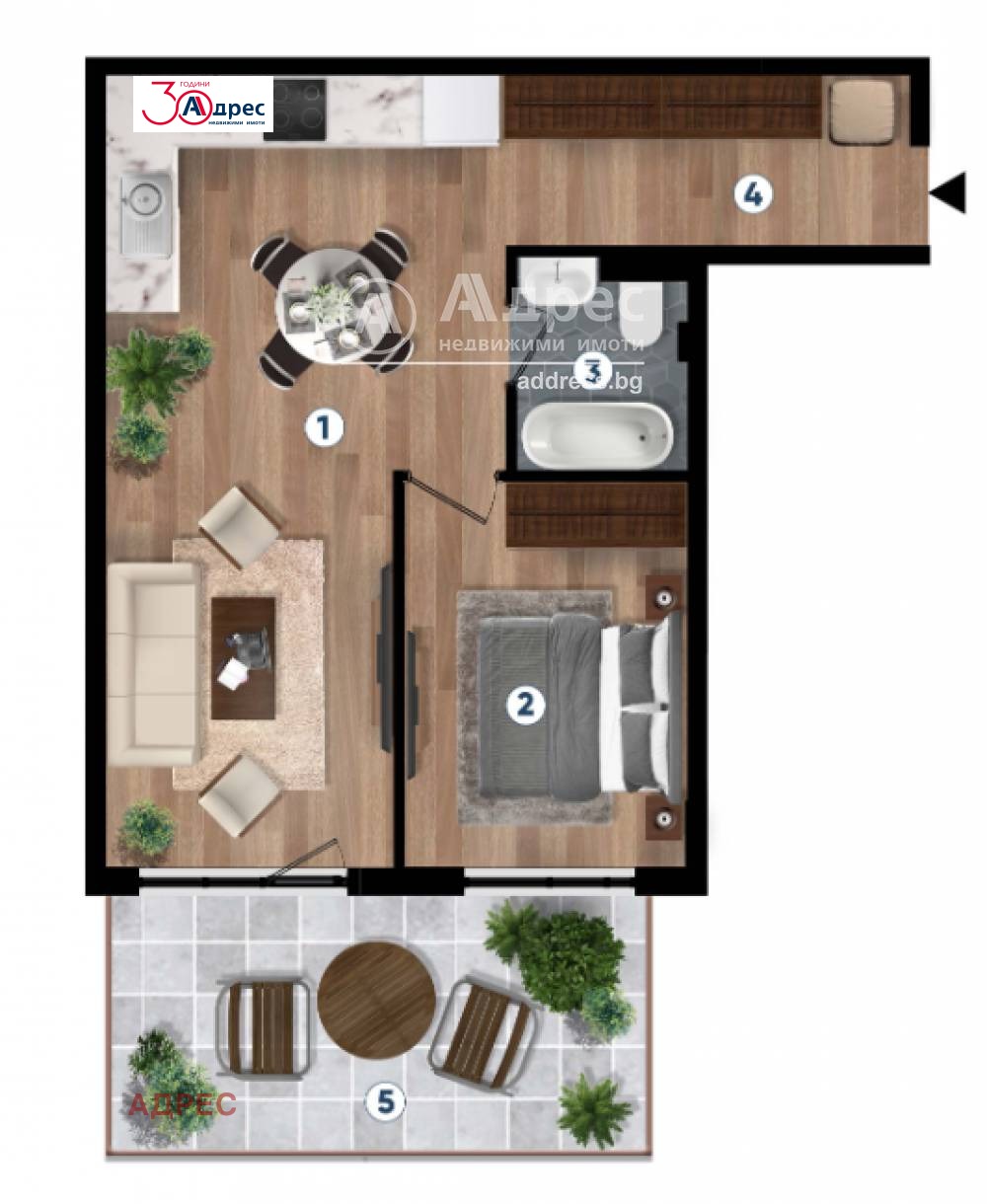 Двустаен апартамент, състоящ се от дневна с кухня и трапезария, спалня, баня с тоалетна, коридор, голяма тераса. Имотът ще се издава по БДС с възможност завършен до ключ. Опция за обзавеждане по индивидуален интериорен проект.