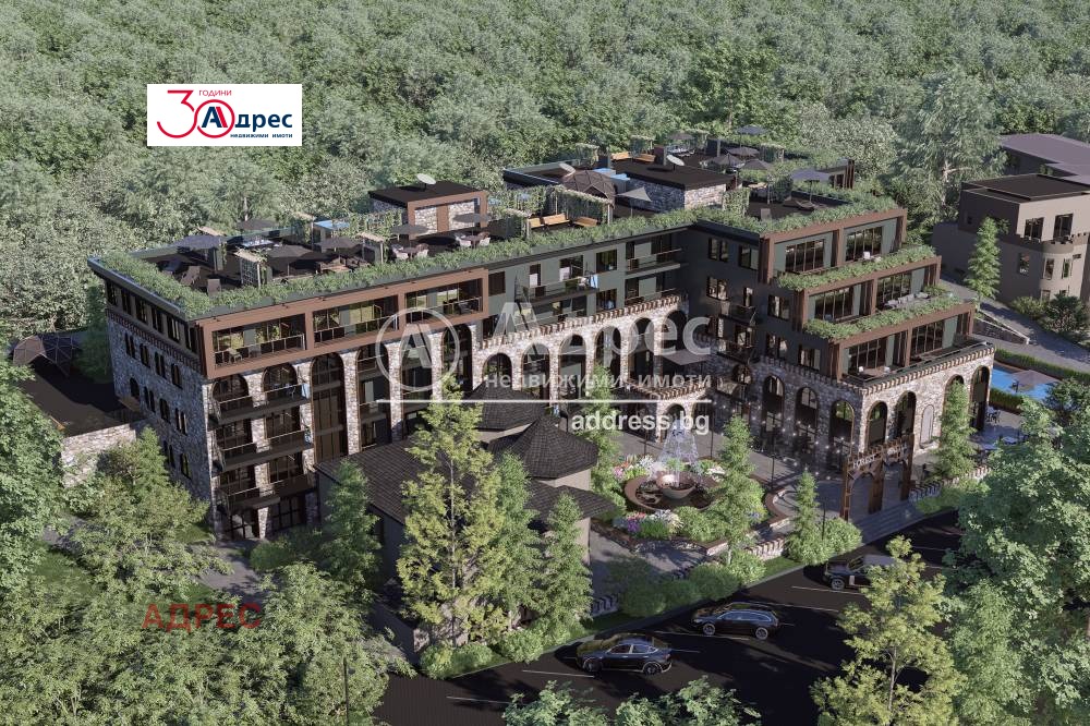 Пететажна жилищна сграда в затворен тип комплекс. В строежа на сградата ще бъдат вложени висококачествени материали: облицовка с естествен камък 'Гнайс', стенна декорация: декоративна мазилка, дървена облицовка, немска 5-камерна дограма, външна изолация: по проект; външни входни врати: метални, блиндирани. Намира се в защитен район, разполагащ със собствено езеро, гора, спа зона, зона за отдих и активен спорт и др.