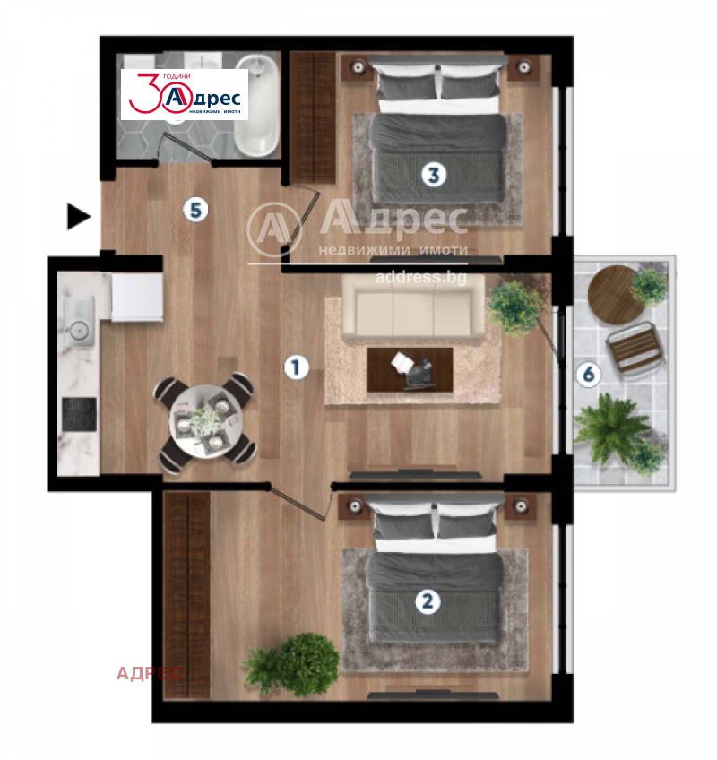 Тристаен апартамент, състоящ се от дневна с кухня и трапезария,2 спални, баня с тоалетна, тераса. Имотът ще се издава по БДС с възможност завършене до ключ. Опция за обзавеждане по индивидуален интериорен проект.