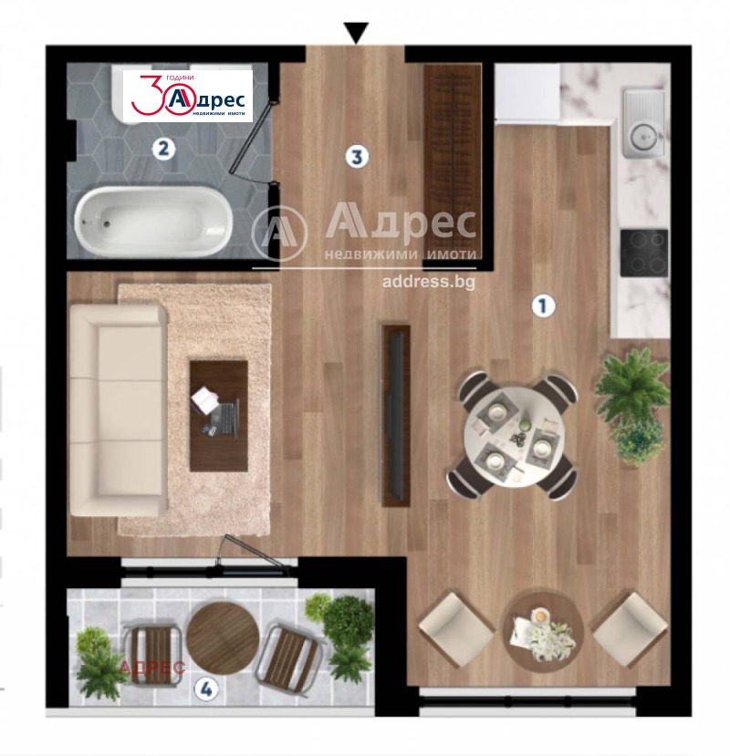 Двустаен апартамент, състоящ се от дневна с кухня и трапезария, спалня, баня с тоалетна, коридор, тераса. Имотът ще се издава по БДС с възможност завършен до ключ. Опция за обзавеждане по индивидуален интериорен проект.