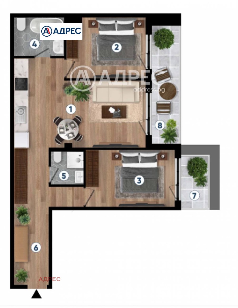 Тристаен апартамент състоящ се от дневна с кухня и трапезария, 2 спални, баня/тоалетна, коридор, 2 тераси. Имотът ще се издава по БДС с възможност завършене до ключ. Опция за обзавеждане по индивидуален интериорен проект.