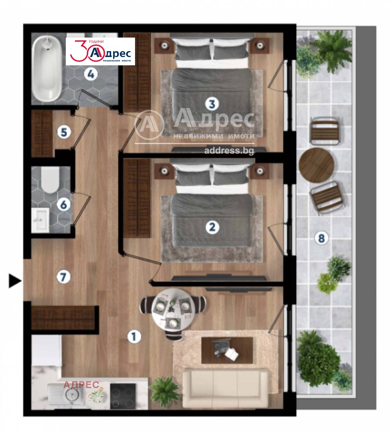 Тристаен апартамент, състоящ се от дневна с кухня и трапезария, 2 спални, баня с тоалетна, отделна тоалетна, голяма тераса. Имотът ще се издава по БДС с възможност завършене до ключ. Опция за обзавеждане по индивидуален интериорен проект.