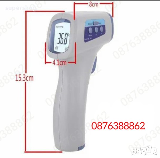 Безконтактен Дигитален Термометър UKC с изцяло нов и патентован дизайн на сондата, гарантиращ висока точност. Притежава отлична адаптация към температурата на околната среда. Точен и надежден дори при сложна среда. Снабден с два режима - човешко тяло и обект (един превключвател за промяна на режима). Бипер за треска или висока температура (стойността на алармата може да бъде дефинирана от потребителя). Също така притежава автоматично извикване на последното отчитане, голям LCD дисплей със задно осветяване и автоматично изключване.Термометърът е приложим за измерване на телесната температура, като събира топлинна радиация излъчвана от челото. Използва се широко в училища, митници, болници, за дома. Този термометър също така може да измерва температурата на обект. Използва се в областта на селското стопанство, промишлеността, храните, нефтохимическата промишленост и др.Характеристики:Метод на измерване: безконтактенЕфективно разстояние: 1-5см.Захранване: 3V = 2 бр. АА алкални батерии (не са включени в комплекта)Индикатор за нивото на мощност: индикация за ниско ниво на мощностПамет: автоматично извикване на последното четенеДисплей: LCD дисплей със задно осветяванеСкала за четене: целзий или фаренхайтАвтоматично изключване: за 30 секундиКомплектът включва:1 х безконтактен термометър;1 х ръководство на потребителя.Продуктите, които предлагаме са чисто нови, с много добро качество и на конкурентни цени. Доставката е с куриерска фирма Еконт, с опциите- тест, преглед, наложен платеж и 10 процента отстъпка от доставката. За поръчки и информация се обадете на посочения номер или напишете съобщение през приложението.*Разгледайте всички мои обяви от менюто по-долу-*ВСИЧКИ ОБЯВИ НА ТОЗИ ПОТРЕБИТЕЛтагове: безконтактен термометър, термометър за телесна температура
