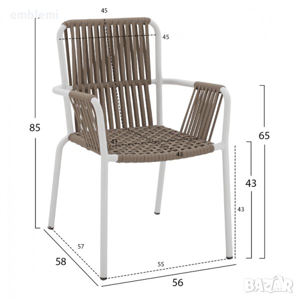 Модерно кресло, изработено от алуминиева конструкция в бял нюанс, обшито с плетена пе широка корда в облегалката в цвят капучино.