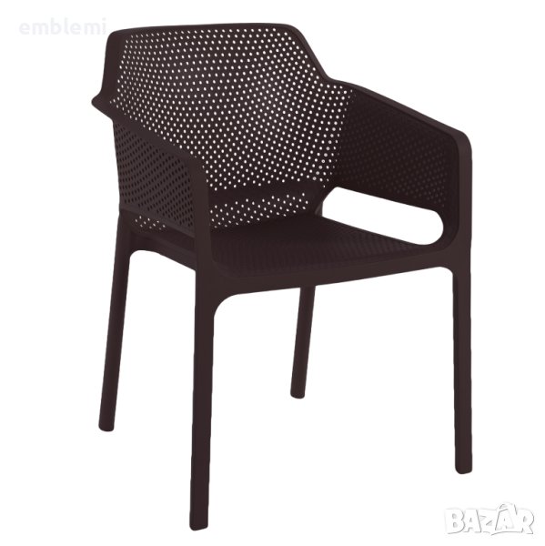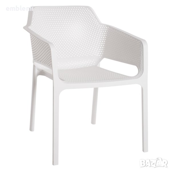 полипропиленово кресло. Идеално предложение за използване във външни пространства, както професионални (банкети, кетъринг компании и др.), така и у дома. Столът се състои от формован и перфориран комплект седалка-облегалка-ръкохватки-крака за по-добра вентилация, докато ръцете са високи и сравнително широки, което води до комфорт по време на употреба. Освен това средната височина на облегалката и седалката са удобни и със сигурност ще зарадват всеки, който седне в това кресло.