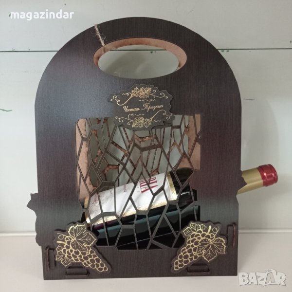 Поставка за алкохол с пожелание" Честит юбилей" или "Честит празник" Поставката е подходяща за бутилка вино 0.75 л. Поставката се продава без бутилката! Снимките с бутилката са само за илюстрация.
