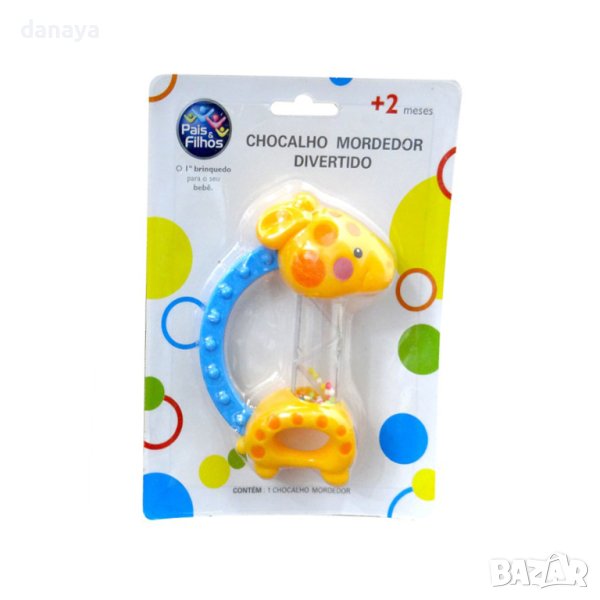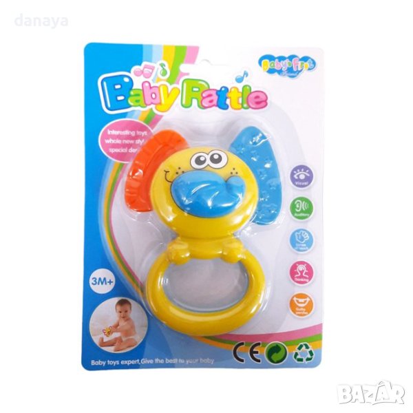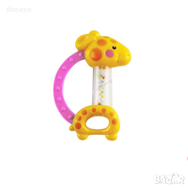Бебешка дрънкалка с ярки и привличащи вниманието цветове. Дрънкалката е с форма на жираф или слонче. Дръжката на жирафчето е гумена, което позволява да се използва и като бебешка гризалка.