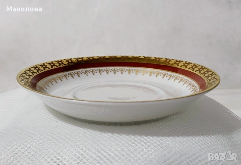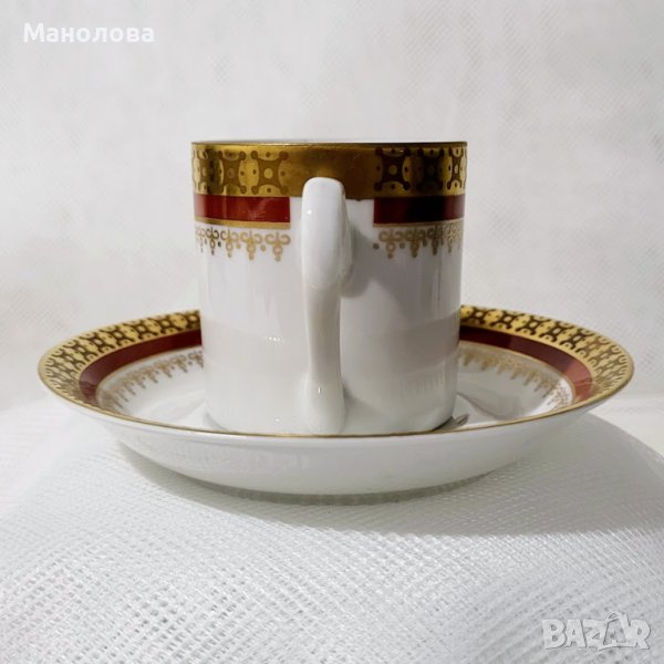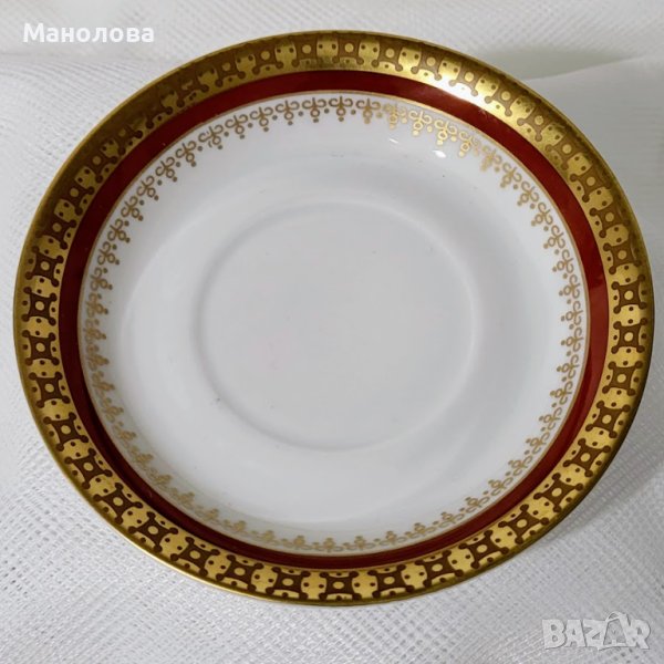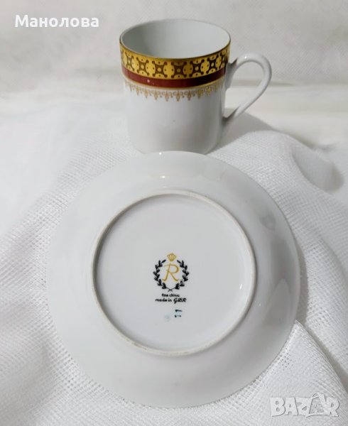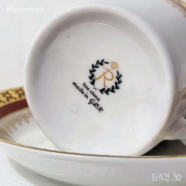 Чашата и чинийката са изработени от бял костен порцелан и са декорирани с филигранна позлата и кантове в цвят бордо. Маркировката „FINE CHINA“ и „MADE IN GDR“. сочи период на производство 1968 и 1990 г. Нямат чипове и наранявания, лека забележка по цветния кант на чашата, моля разгледайте снимките!