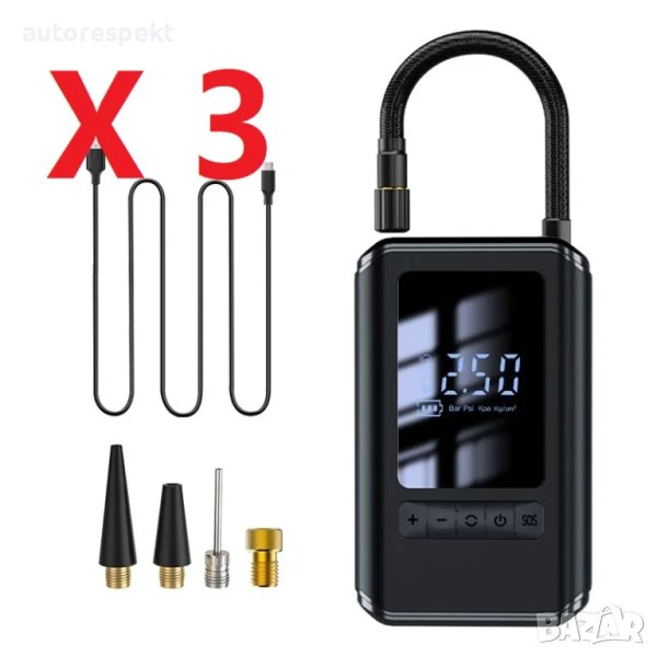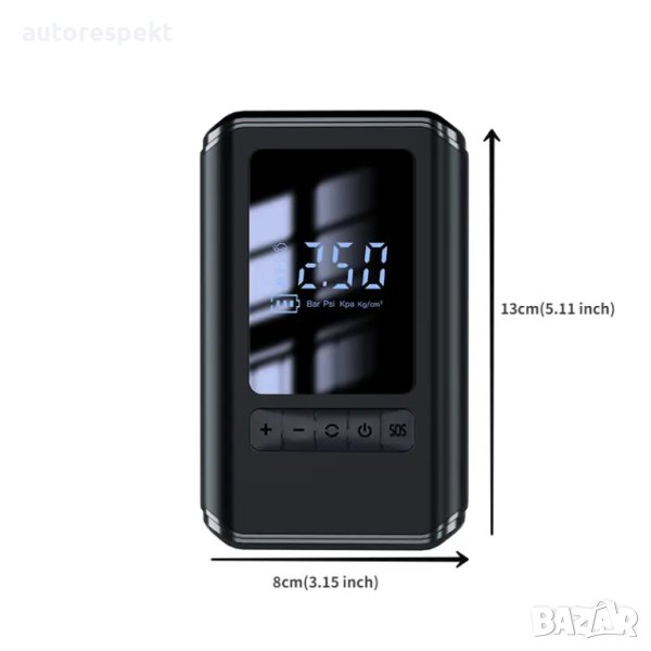 Компресора има цифров дисплей, както и бутон за смяна на различни мерни единици (bar, Kpa, psi, Kg/cm 2). Той автоматично ще се изключи при достигане на предварително зададената от вас стойност на налягането. Отнема по-малко време и усилия от крачна помпа.
