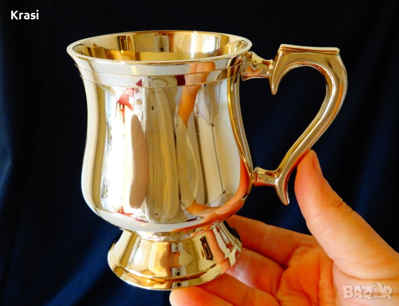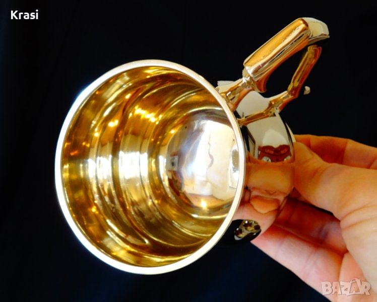 Старинен бокал за вино,чаша за вино,халба,майсторска ръчна изработка от масивен високо качествен бронз,маркиран E.P.N.S.Този бокал има още една по-важна маркировка - логото на модната марка Шанел - две преплетени букви С.Показано за първи път през 1925 г.,върху легендарния парфюм Шанел №5.,а в последствие и върху всички останали продукти на марката.В логото е вкаран смисълът на две обърнати подкови,символ на късмета.