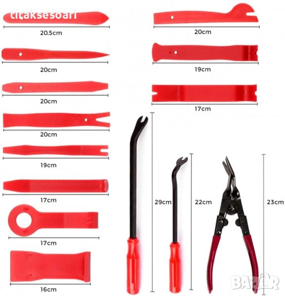 11 инструмента за разглобяване на пластмаса, подсилени със стъклени влакна, с шлицови, прави и ъглови конструкции, за демонтиране на декоративни ленти, огледални стъкла, капаци и панели в интериора и екстериора на купето.