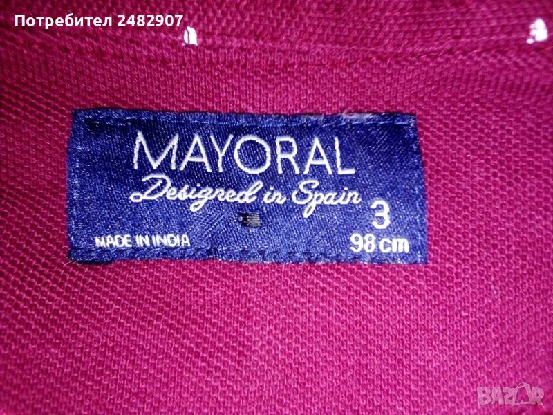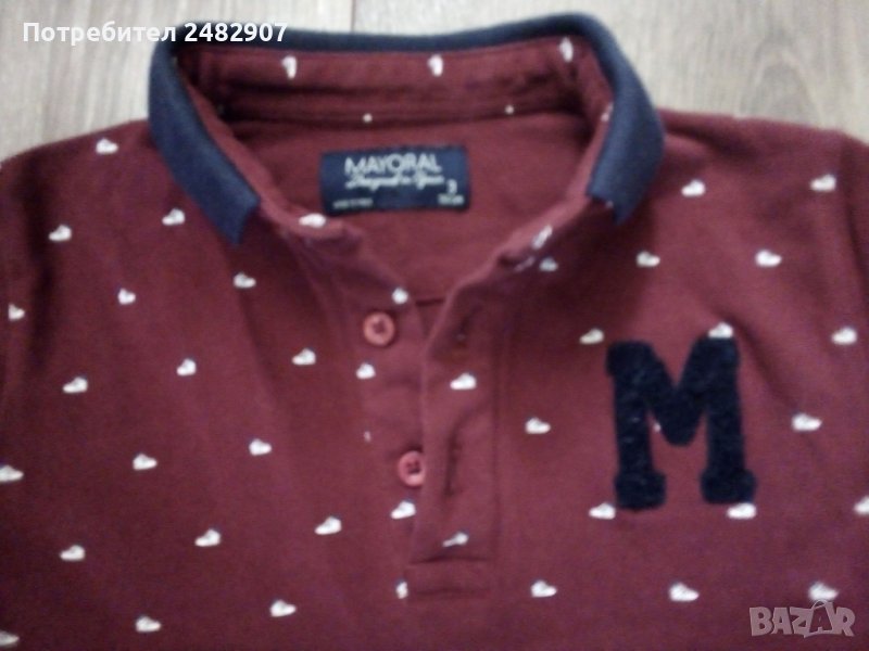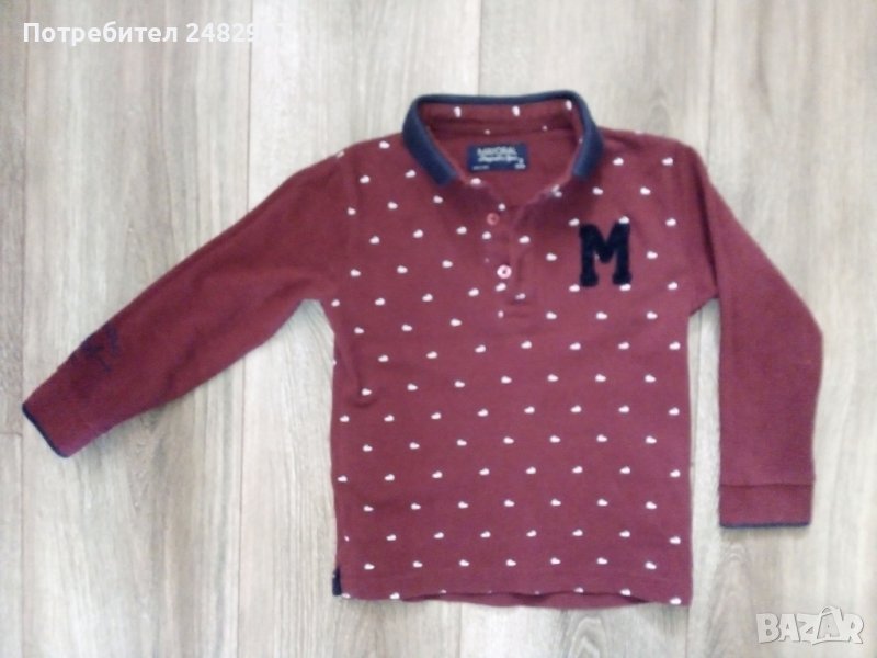Детска блузка за момче в цвят бордо с копчета и якичка за ръст - до 98 см. Съдържа 100 % памук. Ширина в раменете - 28,5 см, ширина под мишниците - 34,5 см, ширина в долната част - 31,5 см, дължина от рамото до долу - 41 см, дължина на ръкава от рамото - 35 см, ширина на ръкава в долната част - 8 см. Много запазена, почти не е използвана, без забележки, с малки цепки отстрани.