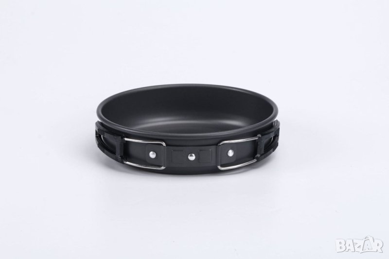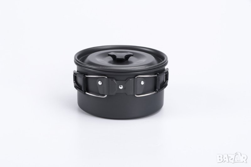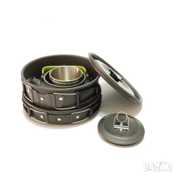 Подходящо за 2-3 души, включва голяма тенджера, тиган, чайник, две чаши от неръждаема стомана, вилица, лъжица, нож за хранене, мрежеста чантичка и заключваща се катарама. Комплектът е изработен от алуминиева сплав, която е преминала висококачествена твърда обработка и е устойчива на висока температура и триене. Ножът, вилицата и лъжицата са изработени от неръждаема стомана 410. Избрана чаша за вода от неръждаема стомана 304, може да се постави в чайника за лесно пренасяне.