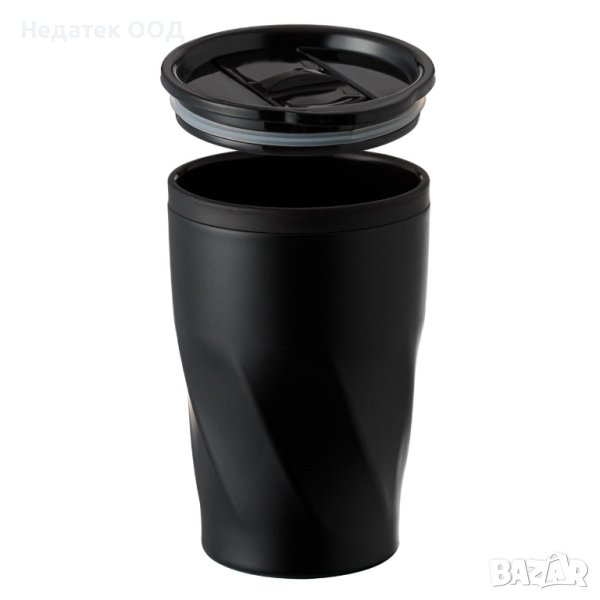 Чаша с метален корпус и пластмасова вътрешност 0% BPA, за пренасяне на кафе, за многократна употреба, в черен цвят с черен капак с накрайник. Капачката е със силиконов пръстен за предпазване от протичане.