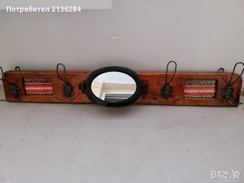 Стара автентична закачалка от царско време, реновирана,добавено е огледало,странични стъкла с мотиви от стара тъкана възглавница-дължина 89см,ширина на дъската без куките 12 см.