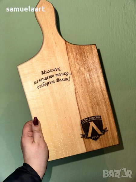 Продавам гравирана даска за мезета с логото на ФК "Левски". Включено е персонализирано гравиране на име и лично послание. Идеален подарък за феновете на отбора. Цена: 32лв