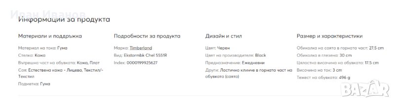 Черни мъжки боти до глезена от Timberland Earthkeepers. Горната част е изработена от гладка кожа, хастарът е подплатен с текстил и кожа. Ботите са със сваляща се текстилна/кожена стелка (против умора) и гумена подметка (Green Rubber). Включени са също дискретно щамповане на лого и разтегливи вложки от двете страни. Височината на дръжката е около 13 см
