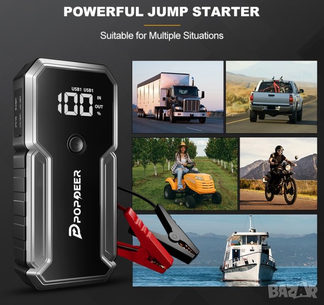 *Уредът може да стартира изтощен акумулатор множество пъти преди ново зареждане, предназначен за 12V превозни средства с до 8L бензинови/газови или 6.0L дизелови двигатели. Мощен, подходящ за аварийни ситуации и зимни условия.