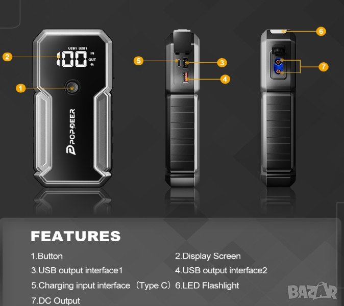 *Размери - 21*9*3cm. *Фенер. *LED екран *Защита от късо съединение / неправилно свързване на клемите / претоварване / висока температура / пренапрежение / презареждане.таг: стартиране на акумулатор, батерия, двигател, зима, аварийно палене на, цена, купи, jump starter