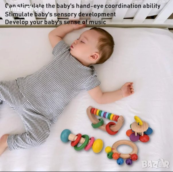 Бебешки дрънкалки , Дървени играчки монтесори 4бр комплект идеален за подарък в красива кутия