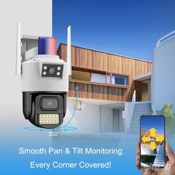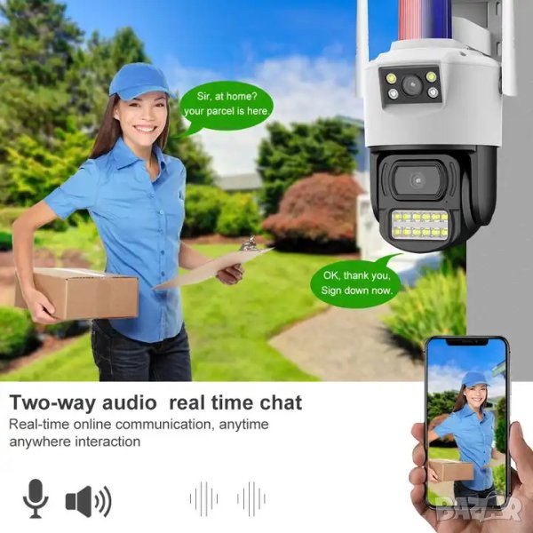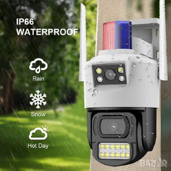 WIFI камера за видеонаблюдение с 2 обектива (2х2MP). Куполната безжична камера дава ясна видимост през деня, използва инфрачервена технология за видеонаблюдение на тъмно, снабдена е с цветна картина в нощен режим с ултра ниска осветеност и засичане на шум. Най-хубавото е вградената функция за „засичане на човешки фигури“ и това, че отчита движение на хора автоматично, изпращайки незабавно съобщение до вашия мобилен телефон, таблет или компютър чрез приложението. Камерата предава сигнала безжично чрез 2.4Ghz Wi-Fi с двойна антена и много по-отчетливо видео в сравнение с тези от други подобни продукти на пазара. Има иновативен дизайн. Подходяща за вътрешен и външен монтаж, за наблюдение на дома, градина, преден и заден двор, паркинг, гараж, офис и за предотвратяване на влизане с взлом. Разпознаването на обекти става с 95% точност, което намалява шанса от фалшиви аларми и гарантира истинска сигурност.