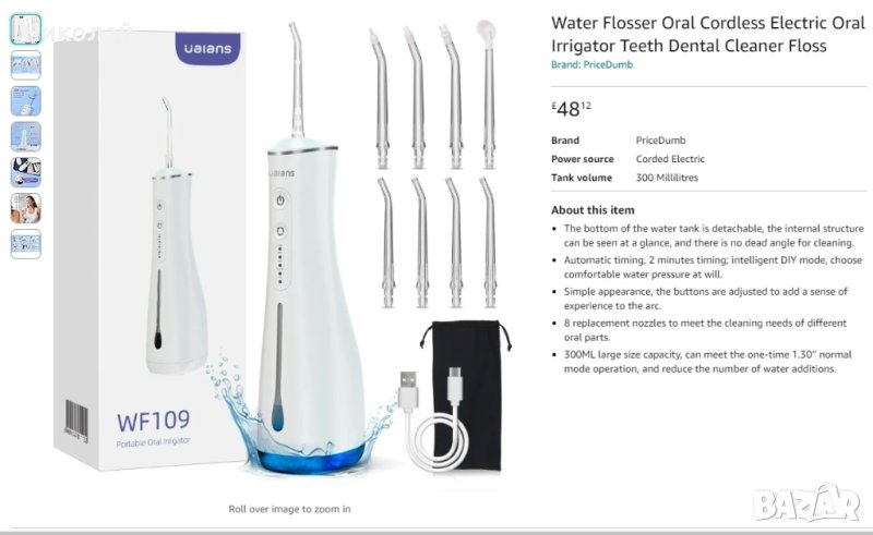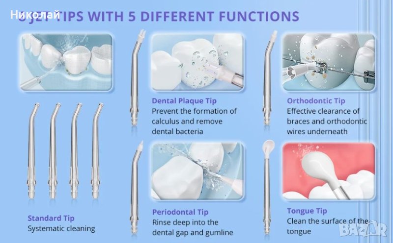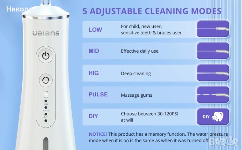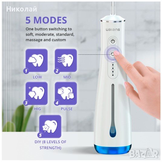IP X7. Управлението на това устройство е наистина много просто. От предната страна има чифт физически бутони за включване / изключване на устройството, както и смяна на режима. Можете също така да видите отделните режими на почистване, като използвате 5 светодиода. Има също масажен режим и щадящ режим за чувствителни венци. Можете да изберете до осем нива на вибрация, ако е необходимо.