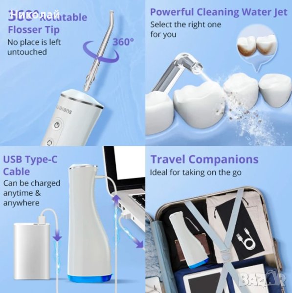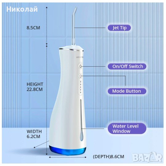 Налягането на водата варира в зависимост от нивото от 50-150 PSI и обем 300 милилитра. Ще бъдете доволни и от таймера с автоматично изключване след две минути, което представлява оптималното време за използване. Оборудването включва също 1400 ма батерия, която предлага продължителност от 50 минути с едно зареждане. Модерният и универсален USB тип C конектор ще се погрижи за последващото зареждане, което ще оцените особено в движение.