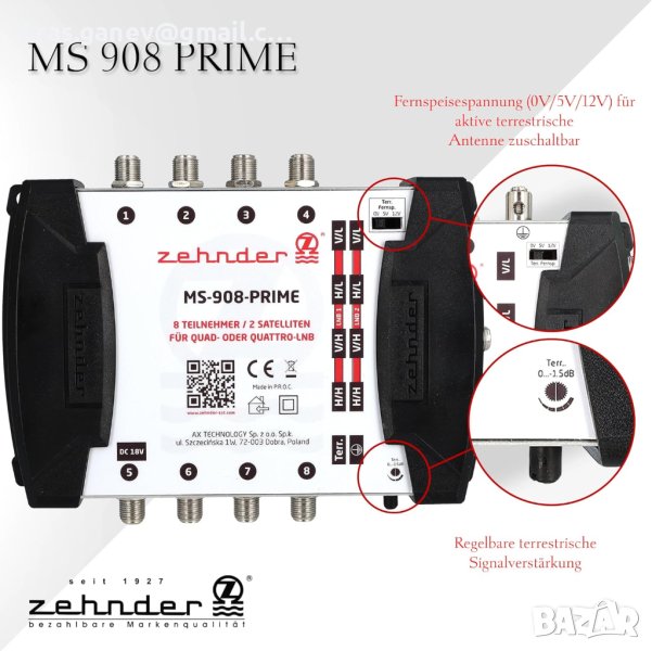 Zehnder MS 9/8 Multiswitch 8 абонати 2 спътника - регулируеми наземни - Quattro и Quad