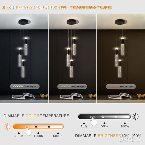 Dimmable Handelier: Предлага се с източник на LED LED светлина, контролиран от дистанционно управление, всеки светлинен цвят може да се регулира в диапазона от 3000K жълта светлина до 6000k дневна светлина, както е необходимо. Цветът на светлината на яркостта (5% до 100%) е равномерен, AC 220-240V, цялата лампа е 18W. Дължина на кабела: 1,5 m