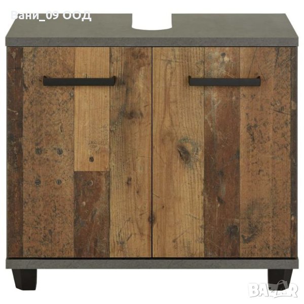 шкаф за баня с размери Ш:68.6/Д:34.8/В:62 см. Артикулът, освен че ще придаде завършек на банята, ще осигури и нужното пространство за съхранението на хигиенни препарати, кърпи, четки и др. вещи в мокрото помещение. Разполага едно отделение с две врати на панти с черни дръжки, зад които е монтиран един рафт с ширина 65.3 см, с макс. товароносимост 5 кг. Корпусът на шкафа е декориран в сив цвят (бетон), а вратичките в различни дървесни текстури, създаващи приятна винтидж атмосфера.