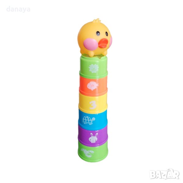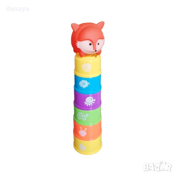 Бебешки чашки за кула. Забавен конструктор от чаши с отвори, които се подреждат в една цветна кула. Комплектът съдържа 6 ярко оцветени чашки, като всяка чаша е с различна форма, което позволява да се прибират една върху друга. Елементите могат да се сглобяват или да се използват за игра самостоятелно. Подходящи са и за банята, в басейна или на плажа. Играчката развива моторните умения на бебето, координацията око-ръка и когнитивното мислене, а ярките цветове насърчават визуалното възприятие.
