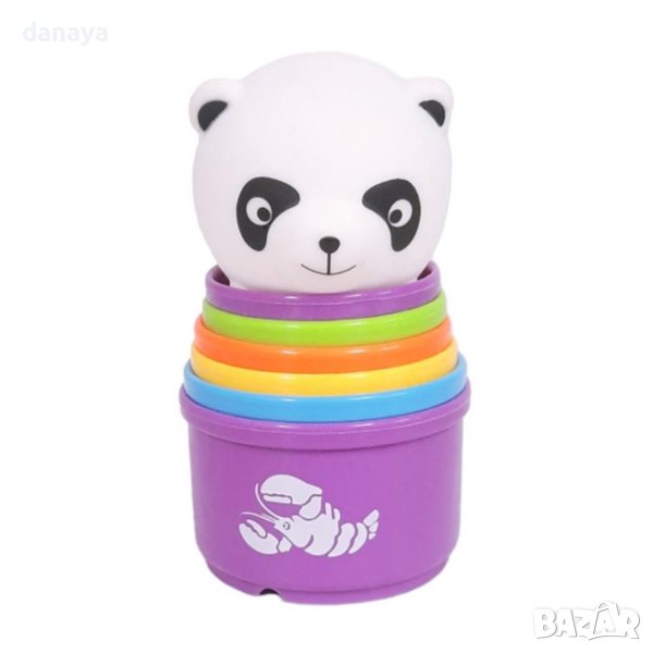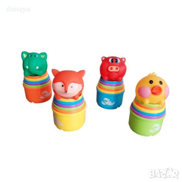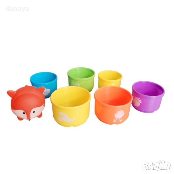 Комплектът съдържа – 6 броя цветни чашки и една гумена играчка животинче – пате, панда, слон, лисица, прасенце.