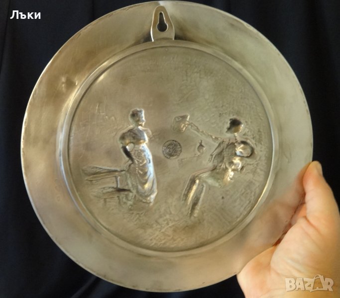 ръчна изработка от 95% калай и 5% сребро.Маркирана.Чинията е релефно гравирана с картина от любовната песен Lindenwirtin: мъж,седнал на маса с кана,вдигнал чанта в ръка и