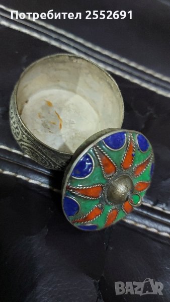 Старинна, емайлирана и богато инкрустирана кутия с капак. Височина-4см. Диаметър- 5,5см.