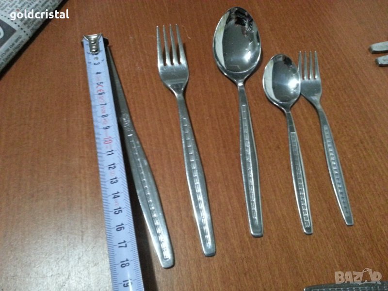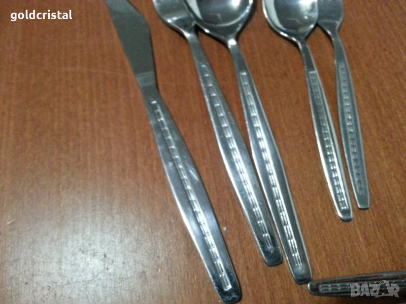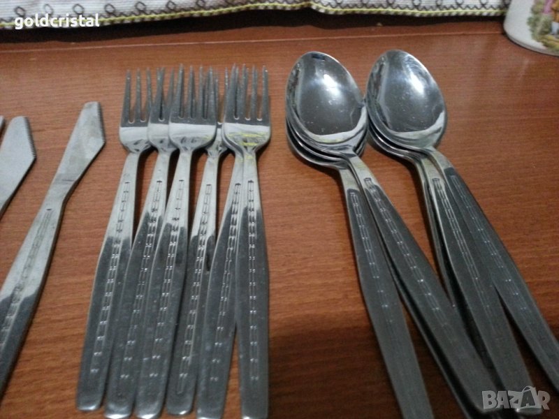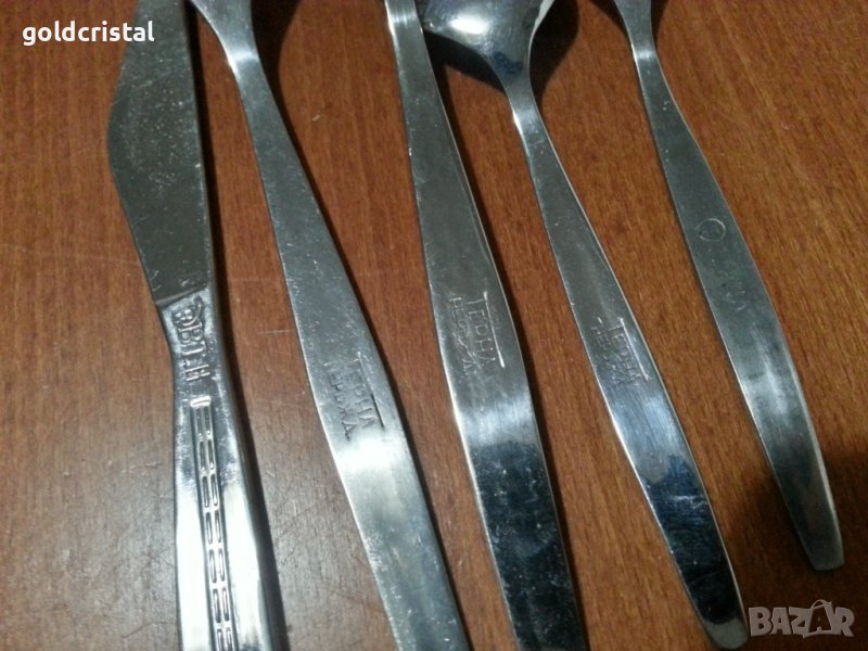 Български прибори за хранене Велико Търново терена много запазени може би нови или много малко ползвани без забележки 6 бр ножове 6 бр вилици 6 бр лъжици 6 бр лъжички 6 бр вилички сервиз комплект сет лот ретро арт декор винтидж колекция стари антикварни предмети обзавеждане за дома и семейството подходящи за подарък за ценители и колекционери