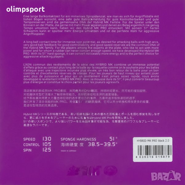 Гумата Hybrid MK PRO за опитни играчи, които обичат да играят с повече мощност и за които гумата никога не може да осигури достатъчно скорост. Със своята 51° твърда гъба, тя може да преобразува значително повече енергия и е идеалният избор за агресивни атакуващи играчи. Тенис гума за по добър контакт с топката и огромен потенциал за завъртане.