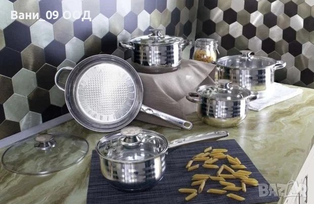 Сет луксозни тенджери и тигани, изработени от неръждаема стомана с 5-слойно индукционно дъно и елегантно сребристо покритие